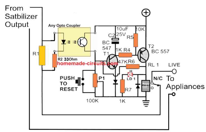 我重新设计并组装了这个电路。因为我的稳定器是1KVA,可以处理4A,所以我使用了一个1ohm 20W的电阻作为电压传感器。我知道这是一个有点高的值,但我已经创建了一个分压器使用10K预设和调整电压,以便只有在4A光耦合器被触发。即使这样也不完美,因为即使是通过光耦合器的微小电流也会触发T1。为了缓解这个问题,我在光耦合器和T1基之间连接了一个100K电阻。我用感应炉尝试了4A电流,把功率设置为1000W,我用万用表精确测量了4A电流。这似乎很有效。当我把功率增加到1200W时,它就会触发。我还没有尝试过1050W, 1100W等等,我稍后会做。在此过程中,我发现了另一个问题; when I connect the output to my voltage stabilizer (already assembled using one of your circuits but this is 500VA), because of the inrush current to the autotransformer, the circuit triggers. I mitigated this issue by connecting a 47mf capacitor (anything less doesn't do the trick) between P1. Now when I increase the power to 1200, the circuit triggers but takes about 1 second to do so.