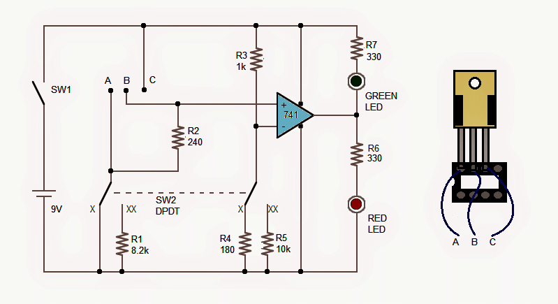 一个DPDT开关用于连接IC的ADJ引脚或接地或电阻R1。接地时,输出应在最低电平1.2V左右,接R1时输出应在最高电平(9V输入时为7.5V左右)。接下来,LM741被用来将输出与预设的电压水平进行比较。