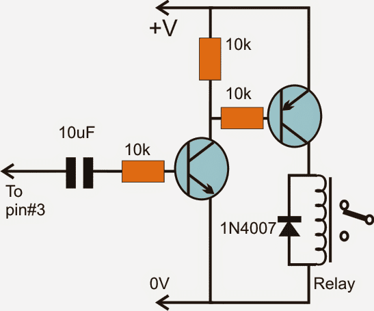 以下电路是为实现继电器激活而设计的。这个阶段可以添加到所有上述4060定时器阶段的引脚#3。